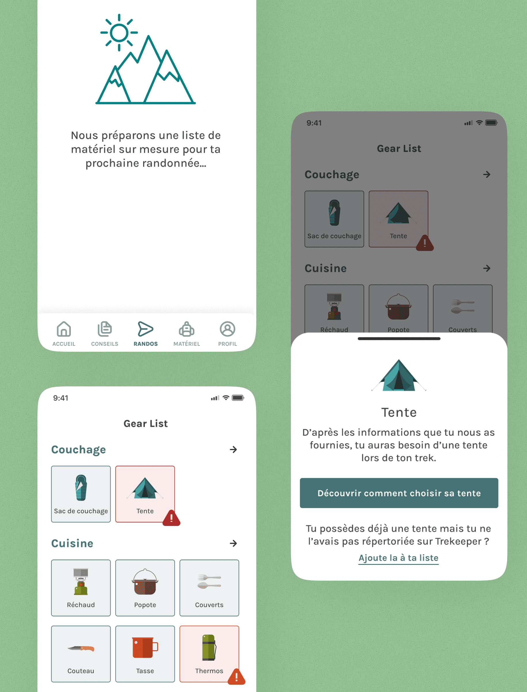 Here, for example, the user has indicated that he will sleep outdoors during his hike, but has not included a tent in his list of equipment. Trekeeper explains why he's missing this equipment, and then suggests he consult a guide to choosing a tent. The guide will contain information to help him choose his new equipment according to his profile and plans.